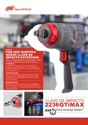 Conozca la llave de impacto neumática de ½" 2236. Nuestro sistema patentado Drive Xchange System™ le permite cambiar los ejes sin necesidad de adaptadores o extensores que agotan el par. Además, su potente motor, su construcción duradera y su funcionamiento eficiente y silencioso convierten al modelo 2236 en la elección perfecta para los técnicos más precisos.